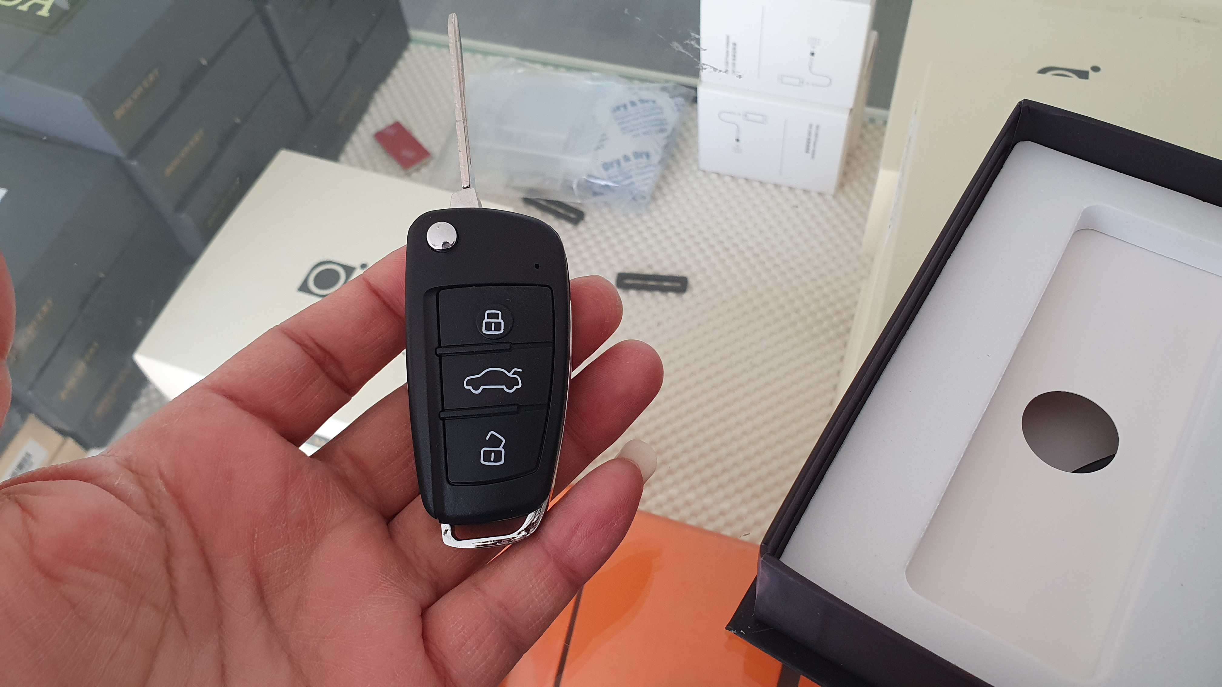 자동차 리모컨을 닮은 폴딩키 디자인의 차키카메라 입니다. 선명한 영상 촬영과 대화녹음까지 가능한 미니캠코더 구매문의 O1O.3779.6532