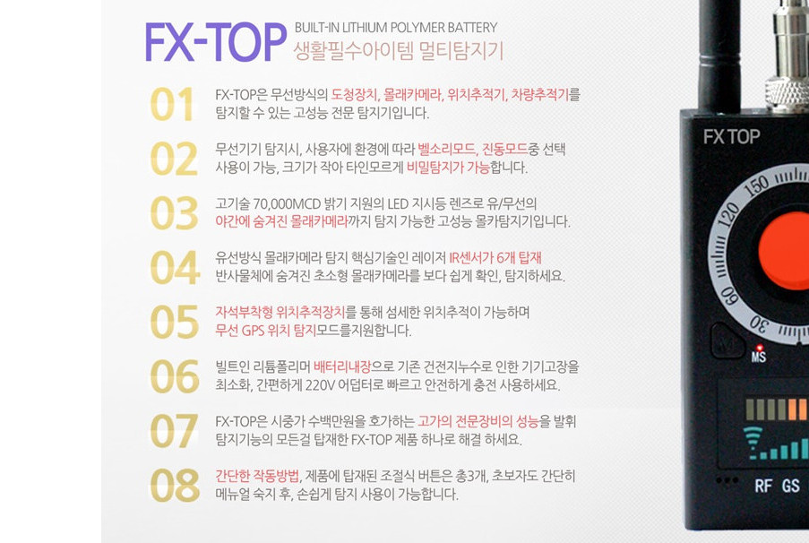 몰래카메라탐지기 도청탐지 찾기 GPS 위치추적기탐색 휴대용 셀프탐지기 FXTOP : 아름정보통신