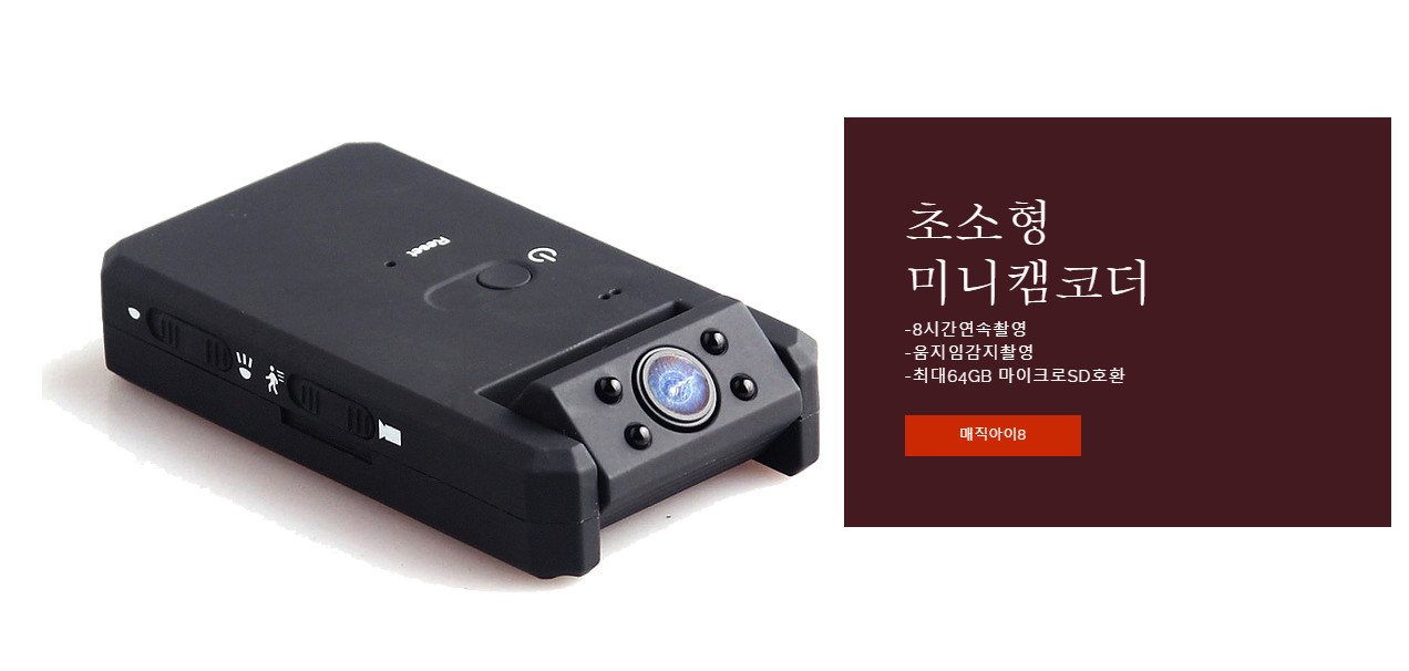 작고 오래 촬영이 가능한 초소형 미니캠코더 매직아이8 야간적외선촬영 및 움직임감지촬영으로 장시간 촬영이 가능한 소형감시카메라 입니다. 블랙박스 및 도난방지용으로 사용하기 좋은 미니액션캠 구매문의 O1O.3779.6532