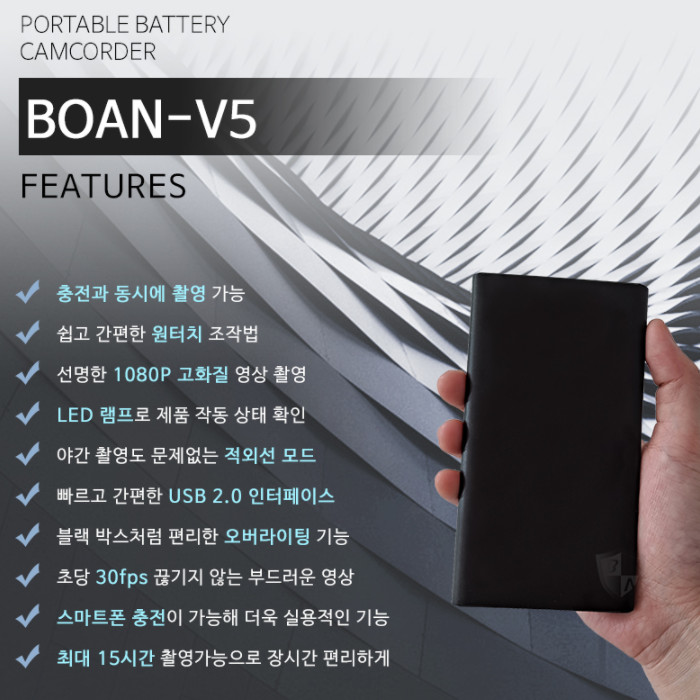 BOAN-V5 보조배터리카메라 15시간 연속촬영 순환녹화기능 장시간증거영상확보