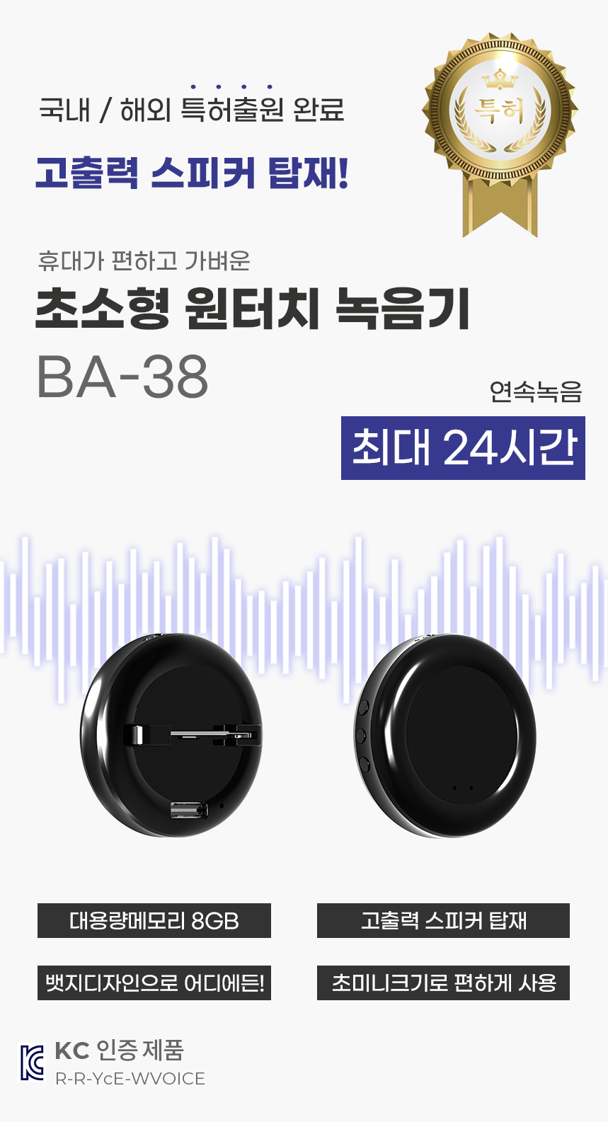 초소형녹음기 신형 뱃지형 휴대용 녹취용 스피커내장 어댑터충전 학교 학원 어린이집 병원 요양원