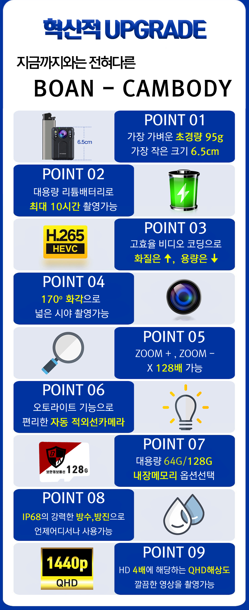 BOAN-CAMBODY 보안 바디캠 10시간 연속녹화 경찰관 소방관 보안요원 택배기사등 폴리스카메라 바디캠 미니캠 액션카메라