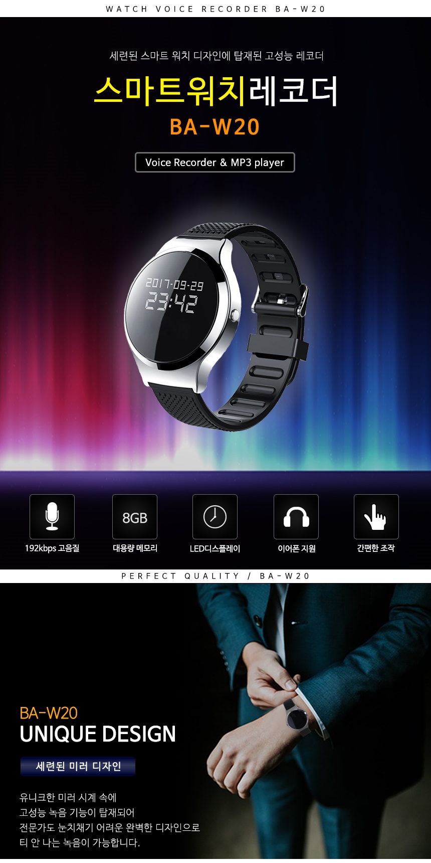 유니크하고 모던한 시계 디자인의 고성능 기능이 탑재되어 티 안나는 녹음이 가능합니다.