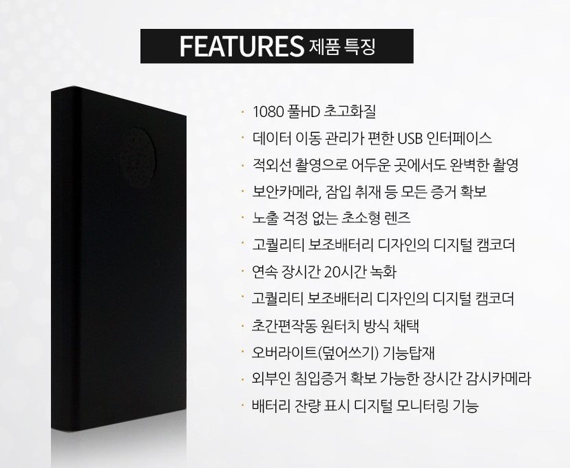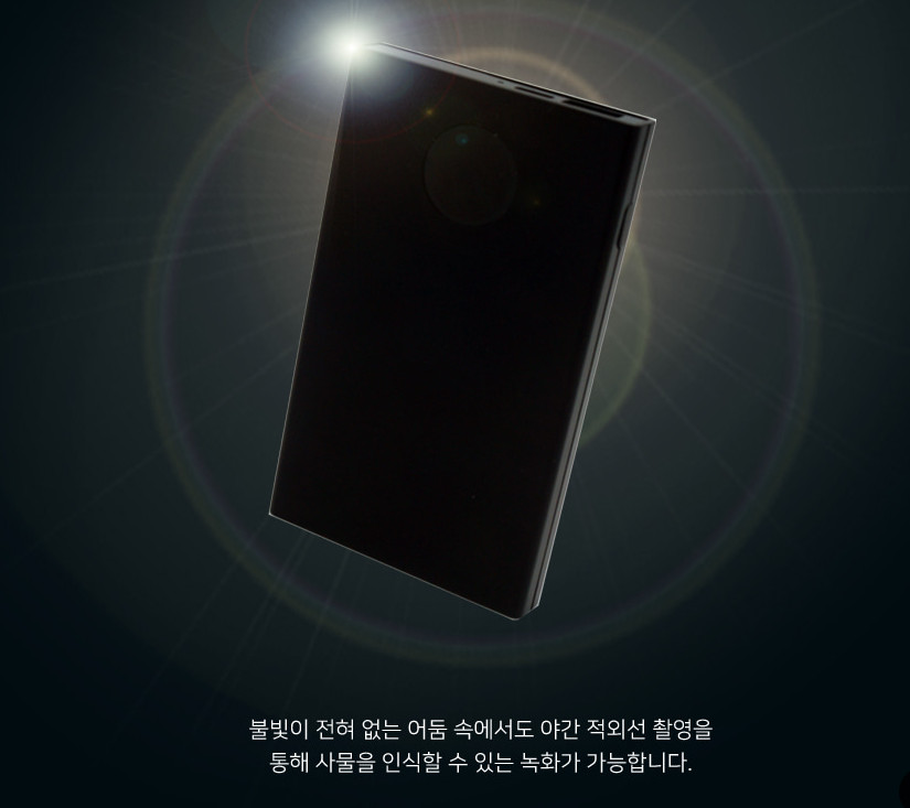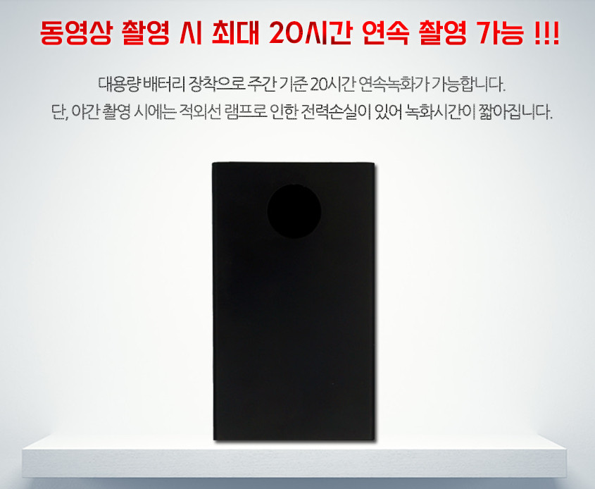 외관은 그냥 평범한 보조배터리처럼 생겼는데, 그 안에 카메라 기능이 있어서 장시간 촬영이 가능한 제품이에요.
