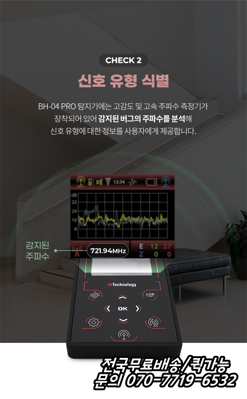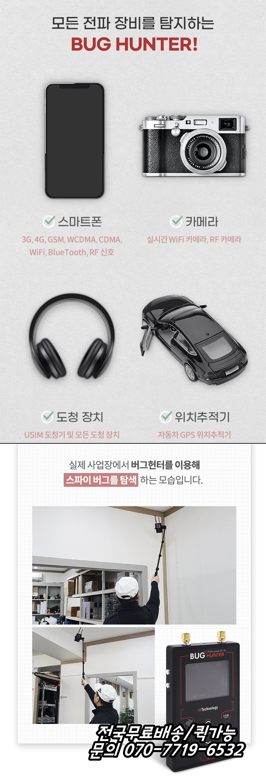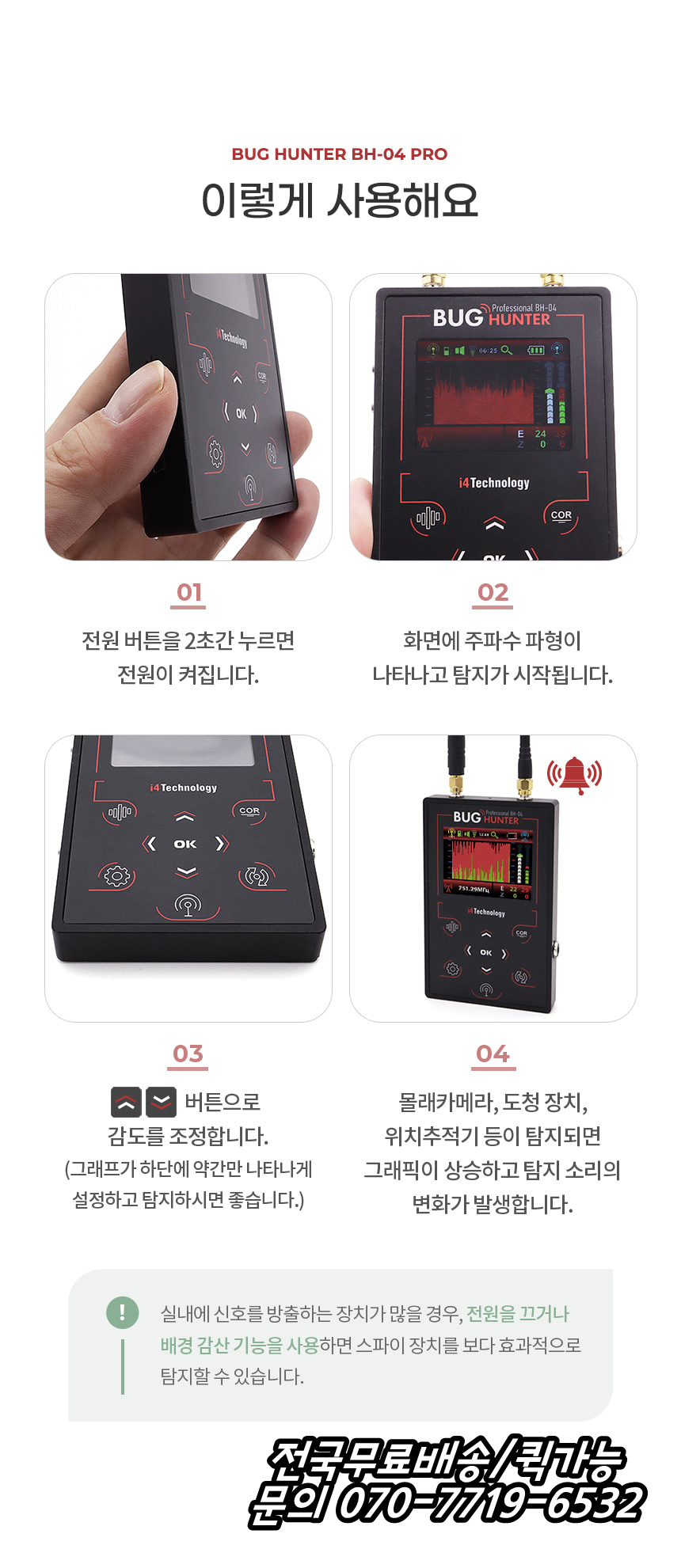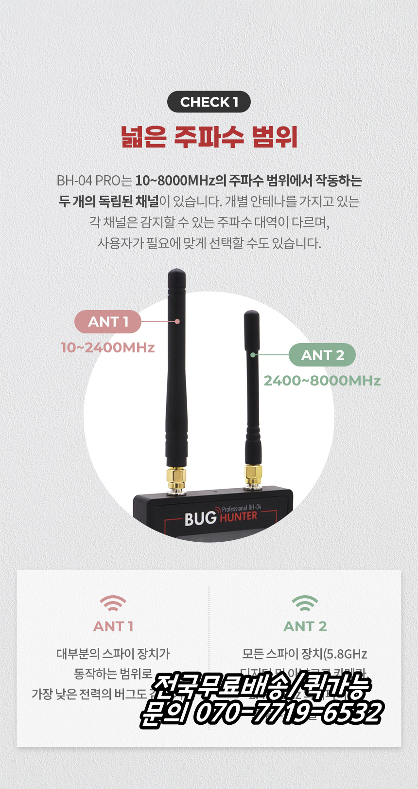 - 넓은 전파 탐지 범위: 1MHZ부터 6,500MHZ 또는 8,000MHZ에 이르는 넓은 주파수 범위를 탐지하여, 주파수 대역을 변경하며 감시를 시도하는 장치들까지 놓치지 않고 찾아낼 수 있습니다.